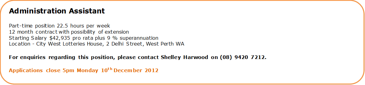 [Administration Assistant Part-time position 22.5 hours per week 12 month contract with possibility of extension Starting Salary $42,935 pro rata plus 9 % superannuation Location - City West Lotteries House, 2 Delhi Street, West Perth WA For enquiries regarding this position, please contact Shelley Harwood on (08) 9420 7212. Applications close 5pm Monday 10th December 2012]