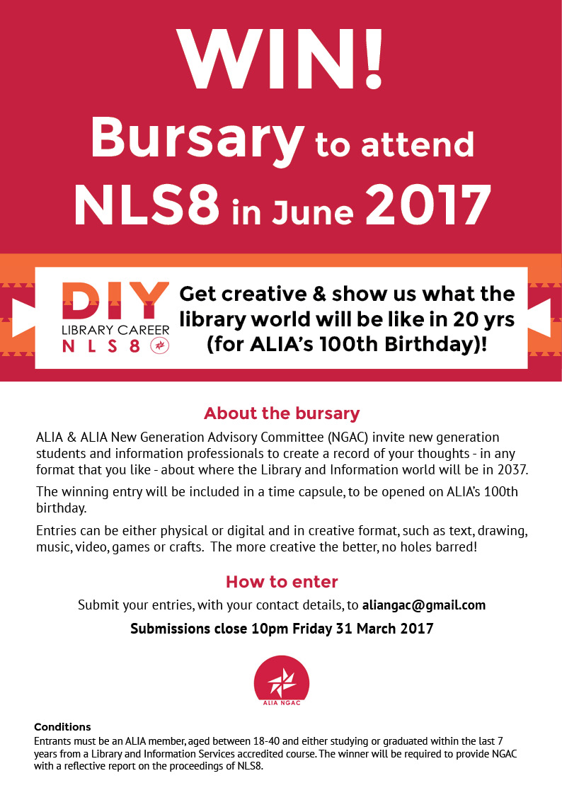 [https://www.alia.org.au/sites/default/files/NGAC-Bursary-NLS8-2017-Poster.jpg]<http://nls8.com/>