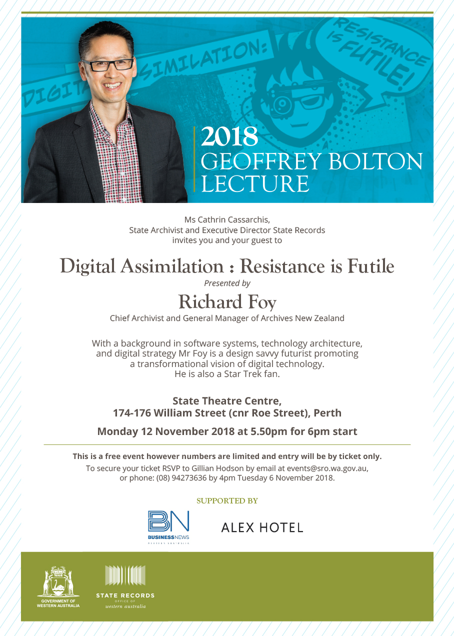 In an age of data breaches, information privacy concerns, digital disruption and apparent societal dystopia, being able to make, keep, find, and re-use information is more important than it has ever been. The 2018 Geoffrey Bolton Lecture will be addressing these and other related issues and please see the invitation attached to the Lecture, which will be held on Monday evening 12 November 2018 at the State Theatre Centre, corner William and Roe Streets Perth. The topic of the lecture is Digital Assimilation: Resistance is Futile! and it will be delivered by Richard Foy, New Zealand's Chief Archivist. With a background in information, software systems, technology architecture and digital strategy, he is a design-savvy futurist promoting a transformational vision of digital technology. He is also a Star Trek fan and will speak about why the keeping of archives encourages responsibility and accountability, and will help us achieve maximum warp drive into the future.