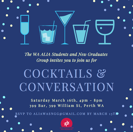 The WA ALIA Students and New Graduates Group invites you to join us for drinks at our first social event of the year.