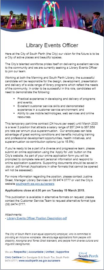 Subject: [WAIN] City of South Perth Libraries - Library Events Officer - 12 month Temporary Contract