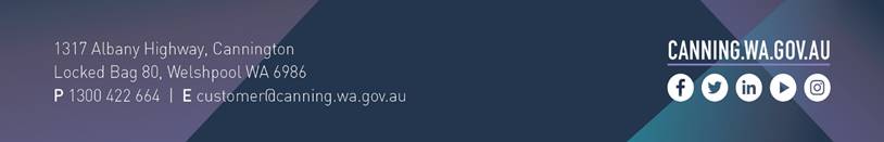 The City of Canning is a "Welcoming and Thriving" place to live and work. We believe that engaging people with diverse backgrounds will assist in delivering superior services to our community and are committed to the principles of equal opportunity for all.
