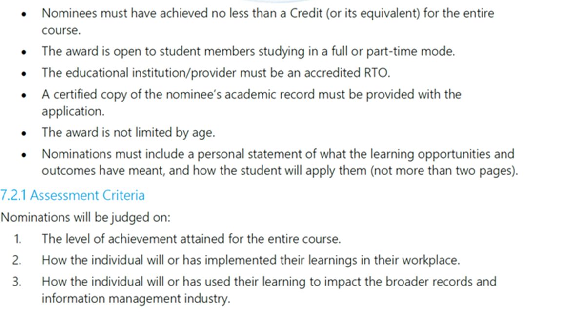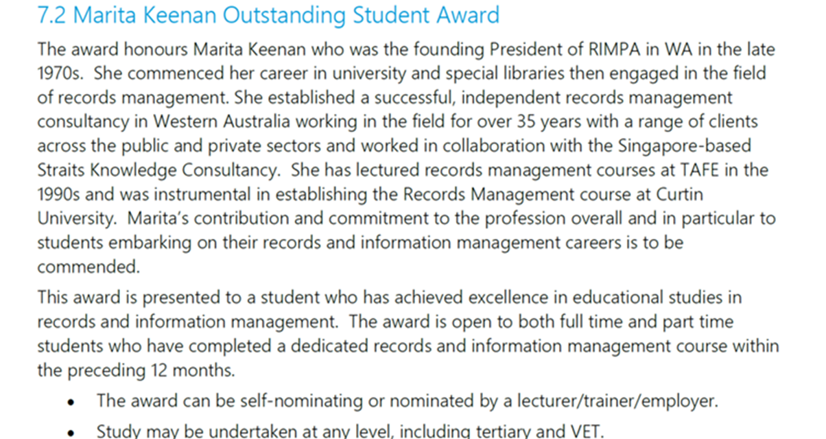 Please consider submitting a nomination for this Records and Information Management Professionals Australasia Award - information below. The award is for students who have completed their course.