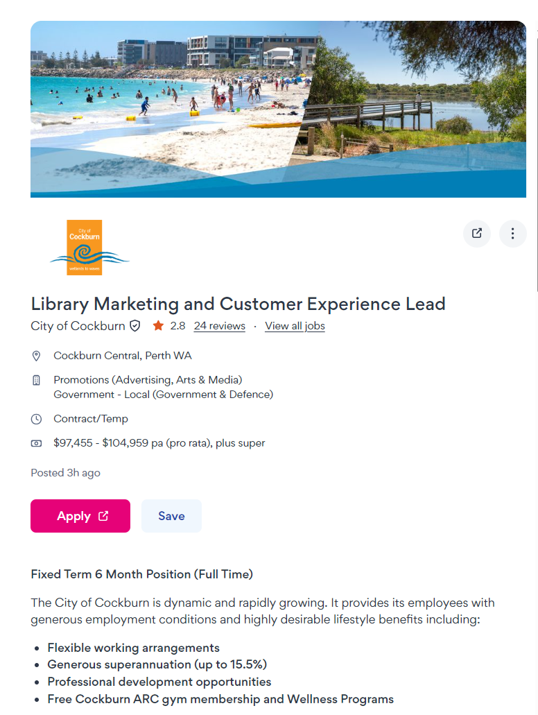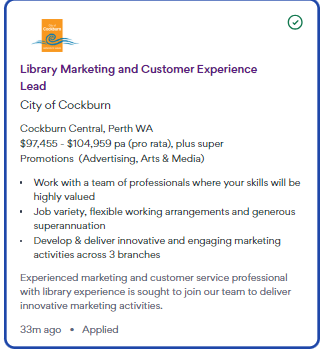 Library Marketing and Customer Experience Lead Job in Cockburn Central, Perth WA - SEEK<https://www.seek.com.au/job/81244754?ref=search-standalone&type=standout&origin=jobTitle#sol=11f91a56845e6f3ce196736974f166d5a4dfd753>