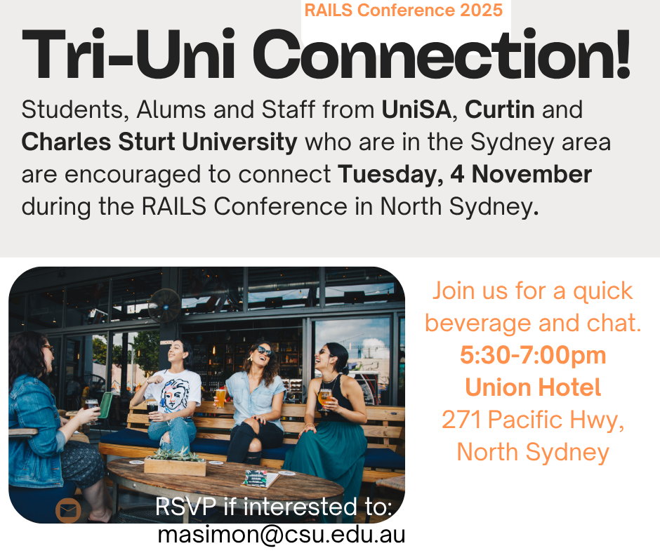 During the RAILS 2025<https://railsconference.wordpress.com/> conference, the key Australasian information conference (which we proudly hosted in Perth, Curtin last year!), our colleagues at Charles Sturt University (CSU) are hosting a special student gathering for students from Curtin, UniSA, and CSU.